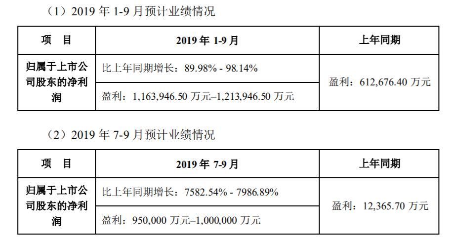 10月14日晚,苏宁易购(SZ:002024)发布2019年前三季度业绩预告。公告显示,1-9 月公司预计实现归属于上市公司股东的净利润为116.39亿元-121.39亿元,同比增长89.98%—98.14%。其中,7-9月实现归属于上市公司股东的净利润为95 亿元-100亿元,比上年同期增长7582%-7986%!